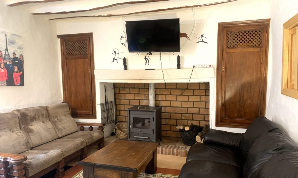 Junto a la entrada de la casa tenemos una sala con 2 sofás de 3 plazas y otros 2 sofás individuales, con televisión y chimenea. Da acceso al Dormitorio de la planta baja y a la zona de la Cocina y el Comedor.